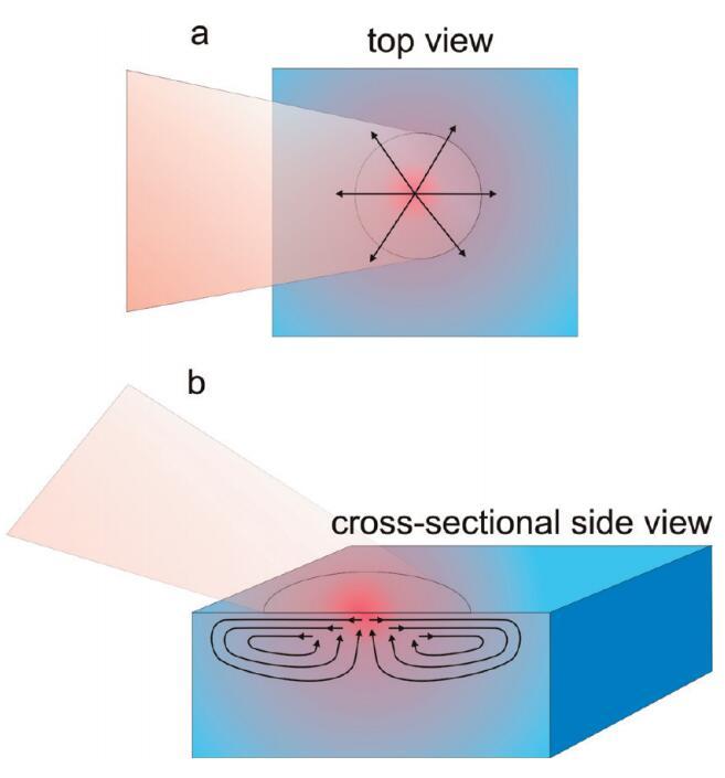 圖4。水樣近表面區(qū)域穩(wěn)態(tài)加熱引起的流動示意圖。溫度示意圖上用顏色表示,其中紅色表示熱,藍色表示冷。橙色陰影區(qū)域顯示入射到表面的激光束,箭頭表示溫度梯度誘導(dǎo)流動的方向。(a)俯視圖,顯示近表面區(qū)域的徑向位移,(b)橫截面?zhèn)纫晥D,顯示產(chǎn)生的Marangoni流動單元。請注意,在焦點的中心,水流向上,因此表面可以有效地持續(xù)更新。