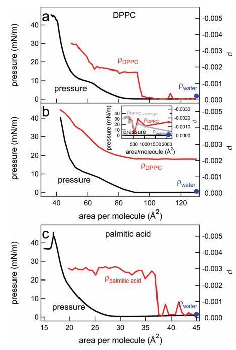 圖8。(a)在制備單分子層后,通過快速添加DPPC溶液持續(xù)壓縮單分子層,直到達到130?2的每分子面積,水上DPPC的表面壓力(黑色,左軸)和橢圓系數(shù)(紅色,右軸)。(b)水上DPPC的表面壓力(黑色,左軸)和橢圓系數(shù)(紅色,右軸)是每個分子面積的函數(shù)。通過逐滴添加更多DPPC,每次滴加間隔幾分鐘,改變了該區(qū)域。以這種方式達到的每個分子的最小面積為2000?2。插圖顯示了橢圓度系數(shù)(對于一個特定實驗(紅色)和三個實驗的平均值(灰色))以及非常低密度下的壓力。(c)在制備單分子層后,通過快速添加棕櫚酸溶液,直到達到每分子45?2的面積,連續(xù)壓縮單分子層期間,水上棕櫚酸的表面壓力(黑色,左軸)和橢圓系數(shù)(紅色,右軸)。在噴灑表面活性劑之前測量的純水橢圓度在每個面板中以藍色圓點表示。