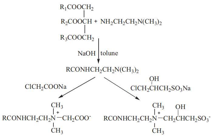 羧基甜菜堿和磺基甜菜堿表面活性劑OCB和OSB已通過(guò)兩步程序成功合成,如方案1所示。第一步是以DMAEA為中間體,從橄欖油的甘油三酯中分離出單甘酯,制備橄欖油酰胺(OA)。第二步是OA分別與氯乙酸鈉和CHPSNa進(jìn)行季銨化。具體程序如下: