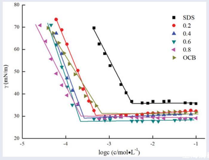 用表面張力法研究了橄欖油兩性表面活性劑(羧基甜菜堿OCB和磺基甜菜堿OSB)與陰離子表面活性劑十二烷基苯磺酸鈉(SDBS)在不同摩爾分?jǐn)?shù)下的表面性質(zhì)。研究了無(wú)機(jī)鹽(NaCl、MgCl2)的加入對(duì)OCB/SDBS和OSB/SDBS體系表面活性的影響。結(jié)果表明,這兩種混合體系在所研究的所有摩爾分?jǐn)?shù)上都比它們各自的組分具有更低的CMC值和更高的表面活性。同時(shí),根據(jù)正規(guī)溶液理論,通過(guò)膠束相互作用參數(shù)(βm)確定了OCB/SDBS和OSB/SDBS之間明顯的協(xié)同作用。觀察到,αOCB=0.6時(shí)的OCB/SDBS混合體系和αOSB=0.6時(shí)的OSB/SDBS混合體系表現(xiàn)出最強(qiáng)的協(xié)同作用。此外,添加無(wú)機(jī)鹽后,二元表面活性劑混合物表現(xiàn)出更好的表面活性,并且無(wú)機(jī)鹽金屬離子的不同價(jià)態(tài)對(duì)混合體系的表面能力影響不同:Mg2+>Na+。