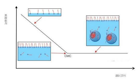 但是當(dāng)濃度超過一個(gè)點(diǎn)時(shí),表面活性劑會開始抱團(tuán),形成膠束,界面張力不再下降,這個(gè)濃度叫做臨界膠束濃度。
