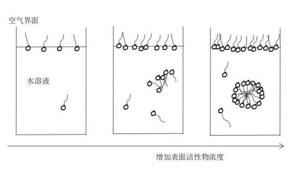 我們在文章開頭介紹過,表面活性劑是一種兩親的分子,一頭親水一頭親油。因此,低濃度時(shí)表面活性劑傾向于留在水的表面,親油(厭水)的一頭朝外,首先布滿水面,也就是水-空氣界面,所以會降低這個(gè)界面的張力。