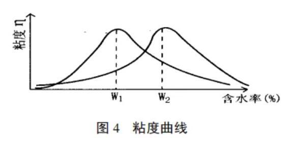 含水量高則流動(dòng)性好(即每個(gè)顆粒表層水膜厚),但凝聚性差,坯體易變形。因此,對(duì)每一企業(yè)來(lái)講,在原料處理、擠泥機(jī)等條件固定的前提下,摸索一個(gè)合適的成型含水率,既利于擠泥機(jī)成型,又利于磚坯強(qiáng)度。根據(jù)我們對(duì)幾十種黏土的試驗(yàn)數(shù)據(jù),每種黏土都有一個(gè)最佳含水率,在這種含水率的情況下,黏土的粘性(稠度)最好。典型的粘度曲線(見圖4):