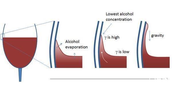 只是因?yàn)轱嬘昧?xí)慣的不同,在法國好的葡萄酒都需要倒入醒酒器中進(jìn)行醒發(fā),在醒發(fā)的過程中,葡萄酒中的酒精會(huì)增大其與空氣接觸的面積,從而導(dǎo)致酒精揮發(fā)的速度,相對(duì)于白酒來說會(huì)快很多,酒體溶液的濃度就會(huì)形成較大的差距,因此就會(huì)導(dǎo)致表面張力形成一個(gè)明顯的變化,因此大部分的葡萄酒就會(huì)出現(xiàn)這種掛壁的現(xiàn)象,也就是法國人說的酒淚。