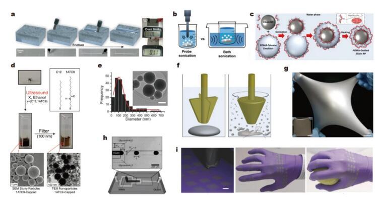 使用超聲和剪切等自上而下的方法將液態(tài)金屬從一個大的液滴分割成許多微米級或納米級的液滴,并保證其粒度分布相對均勻。氧化層或其他人工形成的表面修飾將暫時阻止液滴的重新結(jié)合??衫祀娮釉O(shè)備的圖案可以通過排列這些液滴來繪制,這相當(dāng)于通過減小粒徑以增加比表面積(增加氧化層比例)進(jìn)而降低表面張力。
