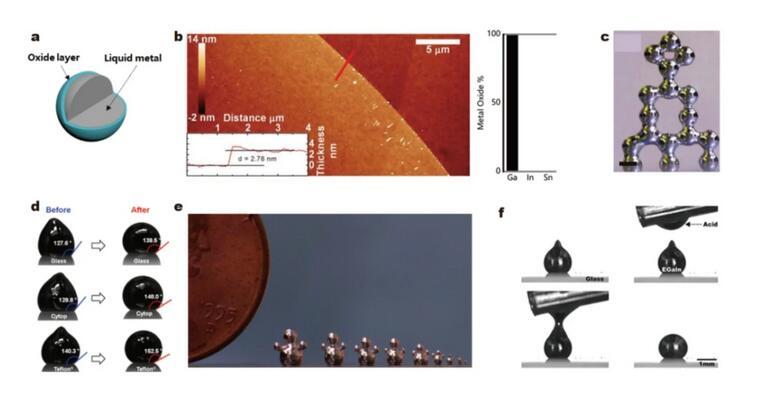 液態(tài)金屬在含有微量氧氣的環(huán)境中就會被氧化,形成0.5–5 nm的自限的氧化層,獲得保持非球面形狀的能力。