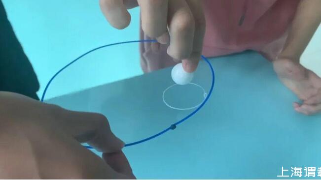 二、棉線打結(jié)成小圈,沾上泡泡水,放在泡泡薄膜上。