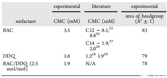 表3:??諝庵蠦AC、DDQ和BAC/DDQ 2:3 mol/mol的表列CMC和每人頭群表面積值?25°C時(shí)的水界面