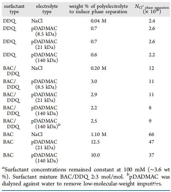 觀察到顯示分離相分離的NaCl/表面活性劑/水混合物,以產(chǎn)生富含表面活性劑的上層相,類(lèi)似于聚電解質(zhì)/表面活性劑/水混合物中的相分離。這說(shuō)明,對(duì)于pDADMAC(21 kDa)和NaCl系統(tǒng),可以通過(guò)改變BAC/DDQ的比率來(lái)控制相界。