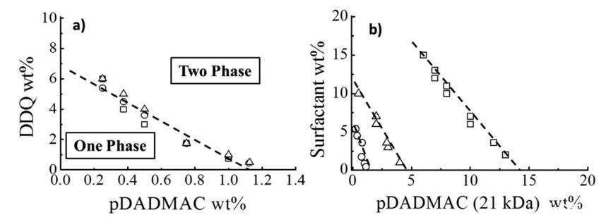 圖4:。(a)pDADMAC/DDQ/水的相分離邊界作為pDADMAC分子量的函數(shù):(□)8.5 kDa(○)21 kDa和(Δ)140 kDa(25°C時(shí))。(b)pDADMAC的相分離邊界(21 kDa)/表面活性劑/水(○)DDQ(□)25°C下的BAC和(Δ)BAC/DDQ(2:3 mol/mol)。虛線(xiàn)表示相界的大致位置。