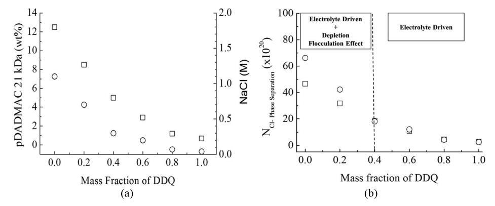圖5:。(a)臨界相分離濃度與BAC/DDQ質(zhì)量比的函數(shù)關(guān)系。表面活性劑(BAC/DDQ)濃度保持恒定(100 mM≈3.6 wt%):(○)NaCl和(□)pDADMAC(21 kDa)。(b)誘導(dǎo)相分離所需的電解液中氯離子的數(shù)量(NCl?相分離)作為BAC/DDQ比的函數(shù)。表面活性劑(BAC/DDQ)濃度保持不變(100 mM/≈3.6 wt%)。電解液類(lèi)型:(○)NaCl和(□)pDADMAC(21 kDa)。