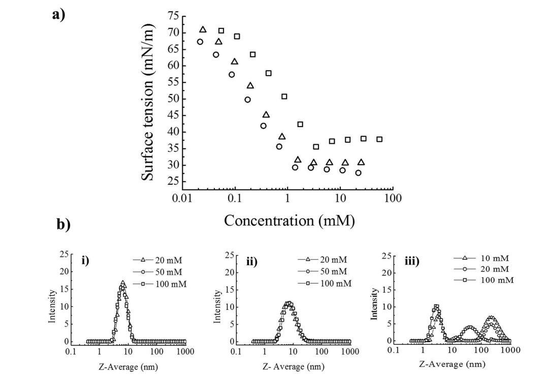 圖1:。(a)25°C水中的表面張力曲線(xiàn)(□)美國(guó)銀行(○)DDQ和(Δ)BAC/DDQ(2:3 mol/mol)。(b)25°C下的PCS強(qiáng)度曲線(xiàn)隨濃度變化:(i)BAC(0.3 M NaCl),(ii)BAC/DDQ 2:3 mol/mol(0.05 M NaCl),和(iii)DDQ(5×10?3 M NaCl)。
