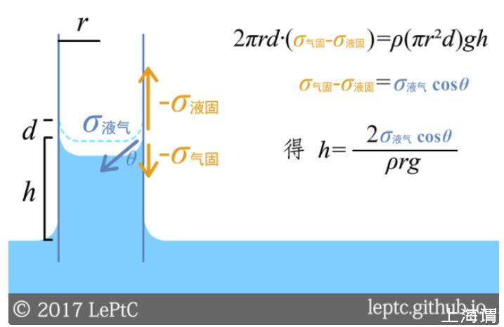講到這里,我們已經(jīng)有三種方法來(lái)解釋這個(gè)現(xiàn)象了:①水想增加自己跟玻璃管內(nèi)壁的接觸面積,直到表面能的消耗不足以補(bǔ)償重力勢(shì)能;②固液接觸面的負(fù)張力把液體向上拉;③凹液面會(huì)降低液體內(nèi)的壓強(qiáng),從而外部氣壓把液體壓上來(lái)。三種方法都能推導(dǎo)出相同的結(jié)論,下圖中給出了第一種推法。