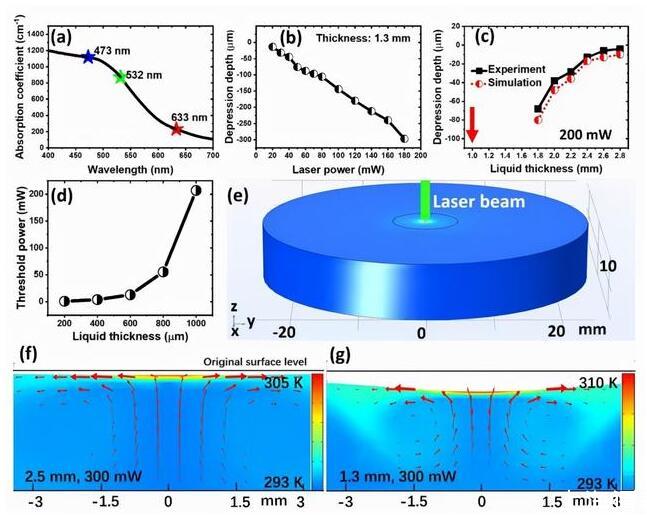 他們發(fā)現(xiàn),液體的厚度、表面張力的溫度系數(shù)、熱導(dǎo)、比熱容、吸光性和粘度等物理參數(shù),都會(huì)對(duì)光致液體形變產(chǎn)生重要影響,尤其是吸光系數(shù)和液體的表面張力溫度系數(shù)。
