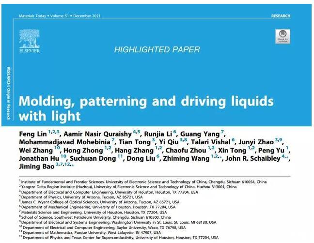 該論文以電子科技大學(xué)第一單位發(fā)表在國際頂級(jí)期刊Materials Today上,并被期刊主編選為Highlighted paper作為亮點(diǎn)工作報(bào)道,論文題為《光驅(qū)動(dòng)液體塑模、繪畫和運(yùn)動(dòng)》(Molding,patterning and driving liquids with light)[1]。