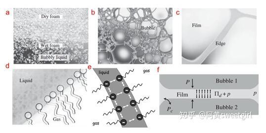圖1.不同尺度下的泡沫結構及穩(wěn)定機制(Ref 1)(a)整個泡沫結構,尺度為0.01 m至1 m。(b)干泡沫的放大部分,尺度為0.1 mm至1 cm。(c)液體通道,也叫Plateau邊界,尺度為1 um至0.1 mm以及肥皂泡膜,尺度為10 nm到1 um。(d)氣液界面的分子層結構,尺度為0.1 nm到10 nm。e-f)氣泡膜在界面靜電力排斥作用即楔裂壓(disjoining pressure)的作用下而穩(wěn)定存在。