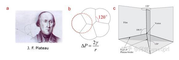 泡沫物理學集中于研究泡沫的結構、靜力學、動態(tài)演變及排液等內(nèi)容。它是一個十分古老的學科,由比利時物理學家Plateau在19世紀中葉開創(chuàng)(圖2a)。Plateau在數(shù)十年的失明的時光里,依舊通過指導他侄子做試驗,堅持研究肥皂泡薄膜的幾何形態(tài)及其背后隱藏的力學規(guī)律。1873年,他和侄子把自己的實驗現(xiàn)象和分析結果做了系統(tǒng)整理,以法文發(fā)表,從此把對泡沫結構的研究由定性印象推到了量化階段,開創(chuàng)了泡沫物理學(Ref 2)。在泡沫靜力學方面,Plateau的主要貢獻在于其提出了干泡沫的靜態(tài)結構力學的三定律,它是后續(xù)泡沫研究的基石: