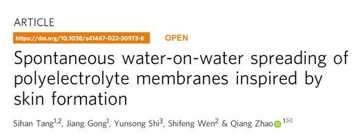 近期,趙強(qiáng)教授課題組在《Nature Communications》在線刊發(fā)了該領(lǐng)域的新進(jìn)展(Spontaneous water-on-water spreading of polyelectrolyte membranes inspired by skin formation,Nat.Commun.13,3227,2022.),提出了一種聚電解質(zhì)水溶液在水面自發(fā)鋪展,形成多孔膜的機(jī)制。文章第一作者是化學(xué)與化工學(xué)院2020屆碩士畢業(yè)生湯思晗,合作單位包括華中科技大學(xué)材料科學(xué)與工程學(xué)院,協(xié)和醫(yī)院。研究得到國(guó)家自然科學(xué)基金,國(guó)家重點(diǎn)研發(fā)計(jì)劃和三峽實(shí)驗(yàn)室開(kāi)放基金的支持。