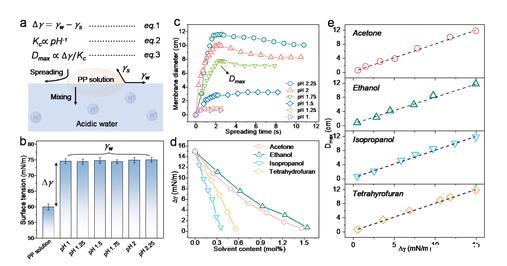 含有聚乙烯亞胺(PEI)和聚苯乙烯磺酸鈉(PSSNa)的水溶液滴在水表面自發(fā)鋪展成膜(圖1,圖2)。一般而言,水溶液液滴與水接觸時(shí)首先發(fā)生向水中的擴(kuò)散與混溶,而非鋪展。為了抑制水-水?dāng)U散與混溶,作者設(shè)計(jì)了PEI-PSSNa和混合溶液,其pH為堿性。當(dāng)該溶液液滴與酸性水接觸時(shí),水中含有的大量質(zhì)子促使PEI高分子鏈上的氨基質(zhì)子化,隨后帶正電的PEI與PSSNa在水-水界面上發(fā)生靜電絡(luò)合,有效抑制了溶液向水中的擴(kuò)散與混溶。與此同時(shí),PEI-PSSNa的表面張力比水低,液滴因此在水表面可自發(fā)鋪展,而非混合。二者協(xié)同,促使了水溶液液滴在水面進(jìn)行自發(fā)鋪展。