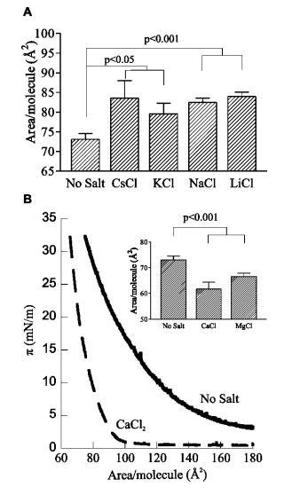 圖3:。各種反離子的影響。(A)用250 mM鹽緩沖HEPES亞相上的L-R PIP2在π)30 mN/m處的每分子面積;平均值(SE,n)5。(B)π-L-R PIP2 HEPES緩沖亞相的面積等溫線,pH 7.4,30°C(實(shí)線),相同條件加250 mM CaCl2(虛線);(插圖)250 mM CaCl2和MgCl2影響的量化;平均值(SE,n)4。