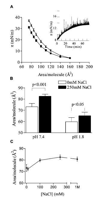 圖1:。NaCl對PIP2單分子膜的擴(kuò)張效應(yīng)。(A)π-含0 mM(9)和250 mM NaCl(2)的等溫線;(插圖)亞相注入250 mM NaCl(時(shí)間)0時(shí),恒定面積/分子的表面壓力變化。(B)在pH 1.8(n)7)和pH 7.4(n)5)條件下,30 mN/m的每個(gè)分子的面積。(C)對亞相NaCl的劑量反應(yīng)。誤差條為平均值(n處為SE)5,除非另有說明。所有數(shù)據(jù)均為HEPES緩沖亞相的L-R PIP2,pH 7.4(除非另有說明),30°C。