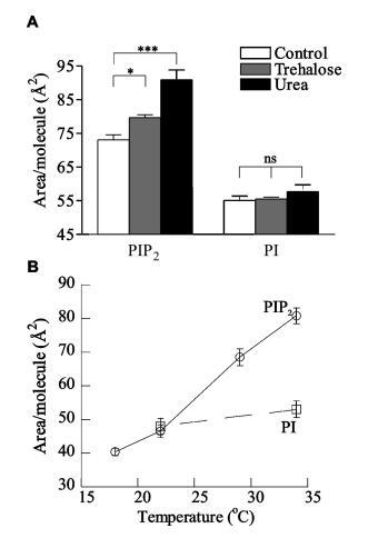 圖4:。水介導(dǎo)分子間氫鍵的證據(jù)。HEPES緩沖亞相上的L-R PIP2和L-R PI在π)30 mN/m時(shí)的每分子面積,pH 7.4(A)存在5 mM海藻糖和5 m尿素,(B)作為亞相(O)PIP2溫度的函數(shù);0)PI)。