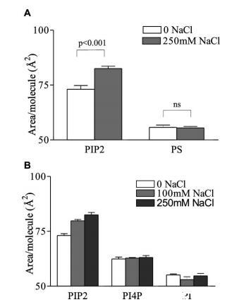 圖2:。鹽膨脹效應(yīng)對PIP2的特異性。(A)L-R PIP2和L-R PS的每分子面積;和(B)HEPES緩沖亞相上的L-R PIP2、L-R PI(4)P和L-R PI,pH 7.4,π)30mN/m下的30°C。平均值(SE,n)4。