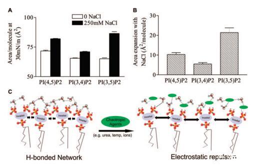 圖5:。亞相氯化鈉膨脹效應(yīng)的PIP2異構(gòu)體特異性。(A)HEPES緩沖亞相上的DO-PIP2異構(gòu)體在π)30 mN/m時(shí)的每分子面積。平均值(SE,n)7。(B)250 mM NaCl和無亞相NaCl之間DOPIP2異構(gòu)體的每分子面積差異。通過雙向ANOVA測量,NaCl效應(yīng)的異構(gòu)體依賴性顯著達(dá)到p)0.0001。(C)PIP2分子間相互作用的概念動(dòng)畫。在沒有潮向性試劑(綠色橢圓)的情況下,PIP2分子形成水介導(dǎo)的氫鍵網(wǎng)絡(luò)。當(dāng)添加潮向性聚合物時(shí),網(wǎng)絡(luò)被破壞,帶電磷酸鹽之間的靜電排斥導(dǎo)致單層的膨脹。