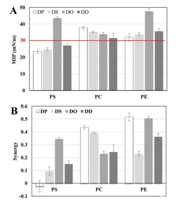 圖7.在鈣存在下,使用DPP、DSP、DOPS、DDPS、DPPC、DSPC、DOPC、DOPC、DDPC、DPPE、DSPE、DOPE、DOPE和DDPE的單層的N-末端肽的MIP(A)和協(xié)同作用(B)值。MIP和synergy值的不確定性如第2.3節(jié)所述計算。