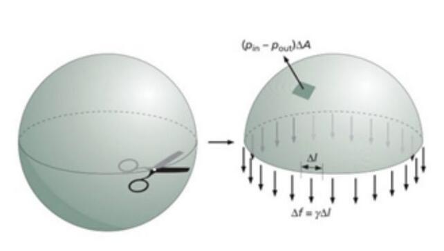我們很容易就會看到,由于表面張力的存在,此時內(nèi)部的壓力肯定要大于外部壓力。其實這個很容易理解:一個氣球就是典型內(nèi)部壓力大于外部壓力的例子,這種壓力差,就是有張力的皮膜形成的。那么,這種壓力差的大小是由什么決定的呢?