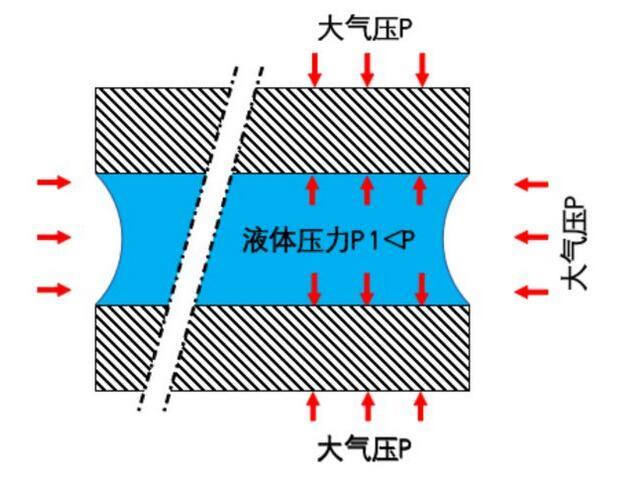 簡言之,上面的圖稍微有點錯誤:水和大氣的界面不是平的,而應(yīng)該是一個凹液面。而恰恰是這個凹液面,導(dǎo)致了完全不同的結(jié)果。具體講,就是使得液體內(nèi)部的壓力低于外部的大氣壓力。