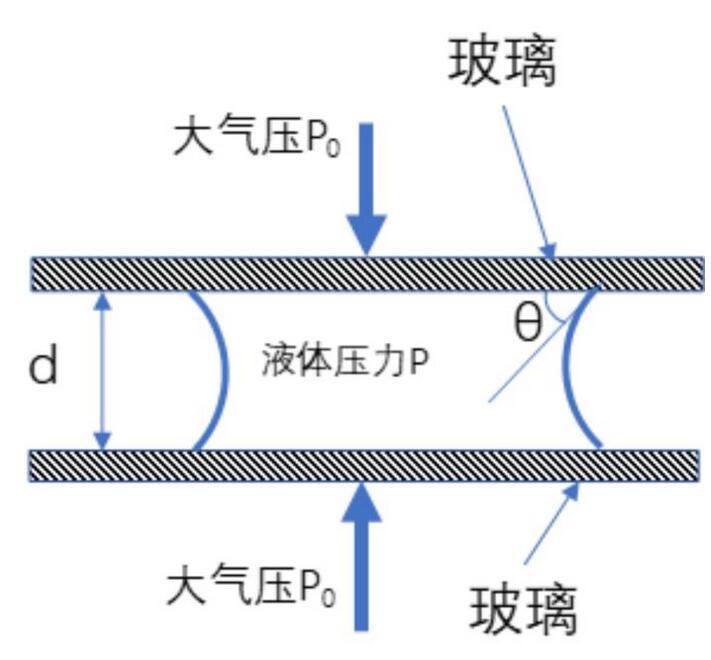 常溫下水的表面張力大約為0.073N/m。水在普通玻璃上的接觸角大約為30°左右。因此,對于貼合較好的兩片玻璃片,很容易計算出這個液膜內(nèi)部的壓力與大氣壓的壓力差為25Kpa–大約為大氣壓的1/4左右。