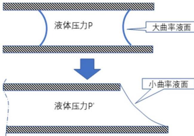 但是當(dāng)我們向著玻璃縫隙滴幾滴水,哪怕只是很少的幾滴,它們之間就不再牢固了,隨著水的不斷滴入,最后就不可避免地分開了。這是因為滴入水不斷進入縫隙,最后就會破壞掉前面所述的曲率很大的液面,導(dǎo)致液體壓力與外界氣壓的差迅速降低,于是它們就無法繼續(xù)沾在一起了。這個過程可以圖示如下: