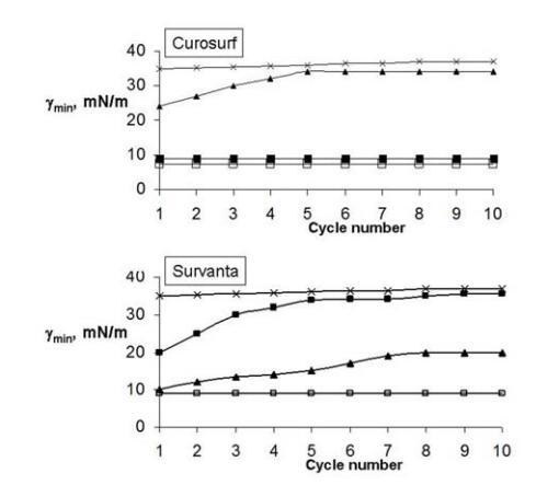 圖1.Curosurf(上圖)和Survanta(下圖)單層的最小表面張力(γmin)對壓縮/減壓循環(huán)次數(shù)的依賴性。符號表示:□-純空氣/水界面處的ESP(鹽水溶液亞相上);在BSA亞相上的x-ESPs(2mg/ml);■-在BSA(2mg/ml)和5%葡聚糖的亞相上進行ESPs;▲-在BSA亞相(2mg/ml)和5%PEG 10000上進行ESP。ESP作為脂質(zhì)體懸浮液擴散,最終濃度為15μg磷脂/ml。實驗在0.15 M NaCl、pH 6.8-7.0、T=25℃下進行。