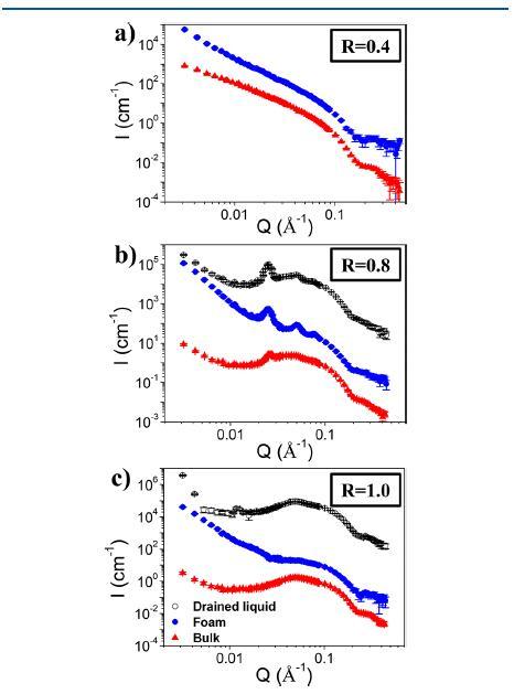 圖2:對(duì)于(a)R=0.4,(b)R=1.0和(c)R=2.0,散裝溶液(紅色三角形)、泡沫(藍(lán)色圓圈)和排出液體(黑色空圓圈)的SANS光譜。為清晰起見,將光譜強(qiáng)度相互偏移了100倍。