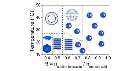 圖1.氫氧化膽堿/肉豆蔻酸體系整體相行為的示意圖,作為R和溫度的函數(shù),根據(jù)參考文獻(xiàn)30的先前研究確定。
