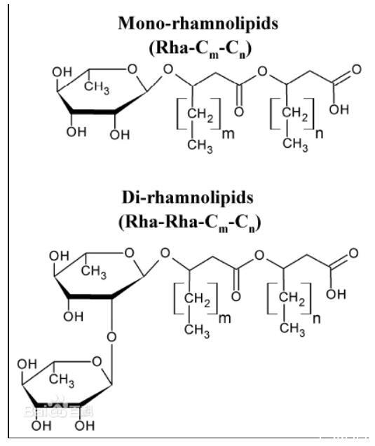 鼠李糖脂的結(jié)構(gòu)多達(dá)幾十種,一般在學(xué)術(shù)界經(jīng)常看到雙鼠李糖脂和單鼠李糖脂的表述。