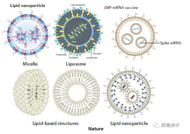 首先在是Nature系列期刊中,就存在兩種明顯不同的示意圖,有的mRNA-LNP示意圖是單層膜結(jié)構(gòu),而有的文章則描述為雙層膜結(jié)構(gòu)。Vaccines和Science期刊中描述的mRNA-LNP示意圖則類似于脂質(zhì)體結(jié)構(gòu),為雙分子層結(jié)構(gòu)。Biotechnology Advances和Journal of Controlled Release期刊則選用了單層膜的mRNA-LNP示意圖。