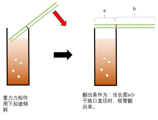 達(dá)到位置最高時(shí),速度為零,這時(shí),重力大于浮力,重力矩的作用下,加速傾斜。那么什么情形下,吸管會(huì)翻出來呢?顯然是吸管翻出時(shí),不被瓶壁阻擋時(shí),才可以翻出來。