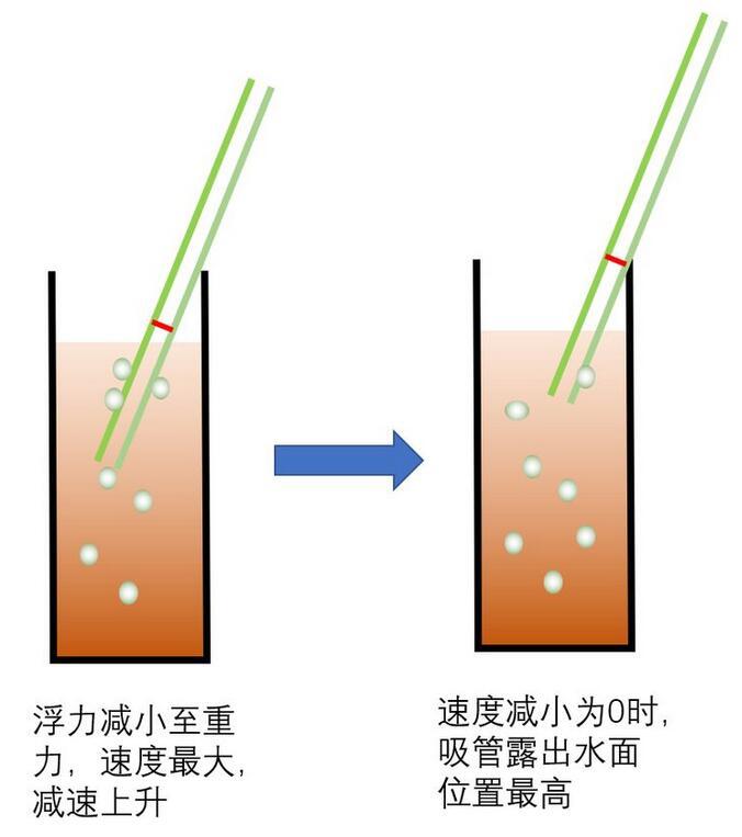 這時(shí)上升過程中,吸管可能因?yàn)樽笥覂蓚?cè)吸附的氣泡數(shù)量不同而發(fā)生浮力差異而傾斜。也可能因?yàn)橥饨鐢_動(dòng)而發(fā)生傾斜,反正吸管豎直上升的可能性很小。習(xí)慣傾斜碰到瓶壁后繼續(xù)上升,上升帶來氣泡的減少,吸管自身浮力的下降。當(dāng)浮力減小到小于重力時(shí),這時(shí)開始i減速,直到速度為零。如下圖所示;
