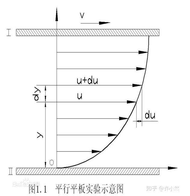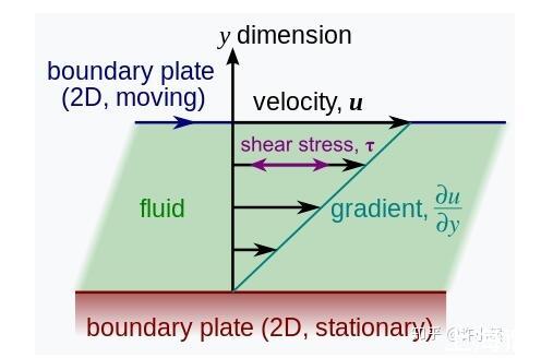 在這張圖中,下方的平板和兩個平板間的液體保持相對靜止,且液體內(nèi)部沒有對自身體內(nèi)不同質(zhì)點(diǎn)的相對流動,而將上方平板做水平向右的推動。可以看見,在與上方平板直接接觸的一層液面處可以達(dá)到與被推動的平板相同的速度,而在垂直距離上越遠(yuǎn)離上層平板的部分的速度越慢,直到最下層與下方平板直接接觸的液面處速度為零,在兩個平板之間存在一個連續(xù)變化的速度分布。