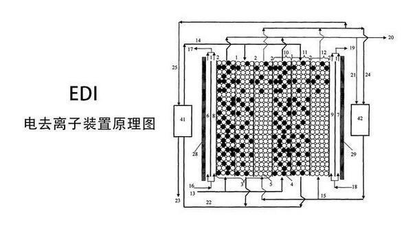 EDI進水中的陽離子和陰離子跟離子交換樹脂中的氫離子和氫氧根離子交換,形成超純水(高純水)。超極限電流使水電解產(chǎn)生的大量氫離子和氫氧根離子對離子交換樹脂進行連續(xù)的再生,可以連續(xù)工作,不需要酸堿化學再生。