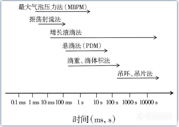 由于對DST時間范圍界定的不同,可運用的測量手段也有所不同。王建坤等認(rèn)為,在達(dá)到靜態(tài)表面張力前的表面張力變化都可算是DST,這個時間范圍以幾毫秒到幾小時計。可用Wilhelmy吊片法、DuNouy吊環(huán)法、滴重法、滴體積法、懸滴法、最大氣泡壓力法測定DST。