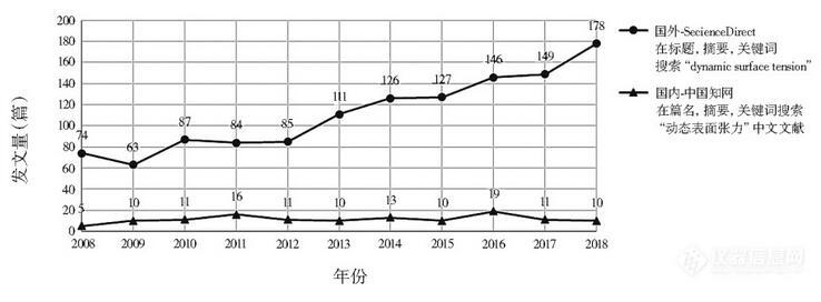 當(dāng)研究的液體吸附過程在快速、持續(xù)進行,且短時間內(nèi)無法達(dá)到平衡時,對液體DST的研究比靜態(tài)表面張力更有意義。如在農(nóng)藥噴灑、噴墨印刷、織物快速潤濕,以及攝影用薄膠片制備中。圖1對比了近10年(2008~2018年)國內(nèi)外發(fā)表的以DST為主要考察項的論文數(shù)。數(shù)據(jù)顯示國內(nèi)在DST方面的研究較少且總體波動不大,而國外則呈持續(xù)上升趨勢。