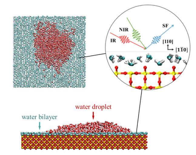 以TiO2的Rutile晶型110表面為例,和頻共振光譜實驗與理論發(fā)現(xiàn)常溫下該表面上有序雙層水結(jié)構(gòu),且該有序結(jié)構(gòu)導致水層上水滴存在。