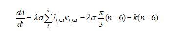 下面我們推導(dǎo)二維泡沫的演變方程,由于任一氣泡跟周圍氣泡的氣體交換都是通過氣泡邊界進(jìn)行的,則氣泡體積(二維氣泡用面積表示)隨時(shí)間的變化率跟邊界長(zhǎng)度和邊界上的壓強(qiáng)差都有關(guān)系,可以表示為
