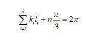 假設(shè)二維干泡沫中的任一氣泡如圖3b所示,氣泡的邊數(shù)為n,從a點(diǎn)開始,再回到a的邊長(zhǎng)分別標(biāo)記為l1到ln,每邊所對(duì)應(yīng)的曲率為k1到kn(Plateau第一定律)?,F(xiàn)在假設(shè)有一點(diǎn)從a點(diǎn)沿著邊向b運(yùn)動(dòng),到b點(diǎn)時(shí),所走的路徑為l1,轉(zhuǎn)動(dòng)的角度為這條邊所對(duì)應(yīng)的圓心角(向外為正,向內(nèi)為負(fù)值),為k1*l1。此時(shí)要想繼續(xù)沿著邊運(yùn)動(dòng),需要向內(nèi)轉(zhuǎn)動(dòng)π/3角度(根據(jù)Plateau第二定律),如圖3b所示。轉(zhuǎn)動(dòng)后繼續(xù)運(yùn)動(dòng),直到到達(dá)原來的點(diǎn)a。此過程,n條邊總共在頂點(diǎn)處轉(zhuǎn)動(dòng)的角度為nπ/3,在邊上轉(zhuǎn)動(dòng)的角度為