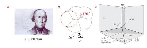泡沫物理學(xué)集中于研究泡沫的結(jié)構(gòu)、靜力學(xué)、動(dòng)態(tài)演變及排液等內(nèi)容。它是一個(gè)十分古老的學(xué)科,由比利時(shí)物理學(xué)家Plateau在19世紀(jì)中葉開創(chuàng)(圖2a)。Plateau在數(shù)十年的失明的時(shí)光里,依舊通過指導(dǎo)他侄子做試驗(yàn),堅(jiān)持研究肥皂泡薄膜的幾何形態(tài)及其背后隱藏的力學(xué)規(guī)律。1873年,他和侄子把自己的實(shí)驗(yàn)現(xiàn)象和分析結(jié)果做了系統(tǒng)整理,以法文發(fā)表,從此把對(duì)泡沫結(jié)構(gòu)的研究由定性印象推到了量化階段,開創(chuàng)了泡沫物理學(xué)(Ref 2)。在泡沫靜力學(xué)方面,Plateau的主要貢獻(xiàn)在于其提出了干泡沫的靜態(tài)結(jié)構(gòu)力學(xué)的三定律,它是后續(xù)泡沫研究的基石: