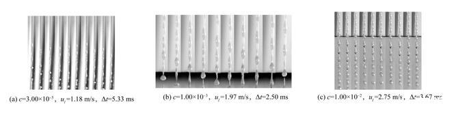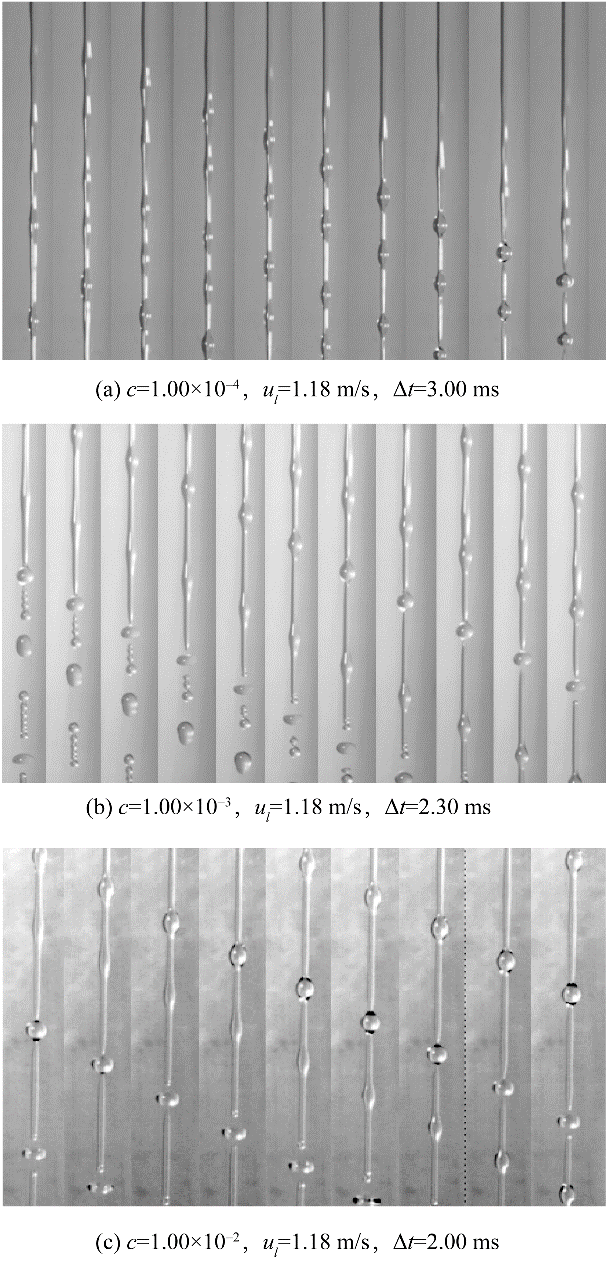 本文首先研究了不含氣泡的表面活性劑射流破裂過(guò)程以探究表面張力變化對(duì)射流破裂特征的影響。實(shí)驗(yàn)使用高速相機(jī)記錄了六種不同濃度表面活性劑溶液的射流破裂過(guò)程。實(shí)驗(yàn)獲得的射流破裂過(guò)程如圖5所示,其中Δt是相鄰兩張圖片間的時(shí)間間隔。從圖5中可以看出,雖然表面活性劑濃度并不相同,但射流的破裂過(guò)程在形態(tài)上是相似的。當(dāng)液體射流離開(kāi)噴嘴后,射流表面擾動(dòng)迅速增長(zhǎng),表面波動(dòng)在射流表面呈對(duì)稱分布,這是射流破裂Rayleigh區(qū)的典型特征。隨著表面波動(dòng)的進(jìn)一步發(fā)展,在射流方向上,射流表面形成瘤狀結(jié)構(gòu),射流破裂發(fā)生在兩個(gè)瘤狀結(jié)構(gòu)之間。