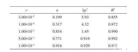 圖4展示了不同SDBS濃度下lg S隨lg t的變化規(guī)律,圖中實(shí)線對(duì)應(yīng)各濃度下動(dòng)態(tài)表面張力的擬合曲線,此時(shí)圖中時(shí)間t的單位為ms。從圖中可以看出,擬合結(jié)果與實(shí)驗(yàn)數(shù)據(jù)吻合較好,擬合曲線能夠較好地表征動(dòng)態(tài)表面張力的時(shí)間演變趨勢(shì)。擬合得到的系數(shù)見(jiàn)表1。